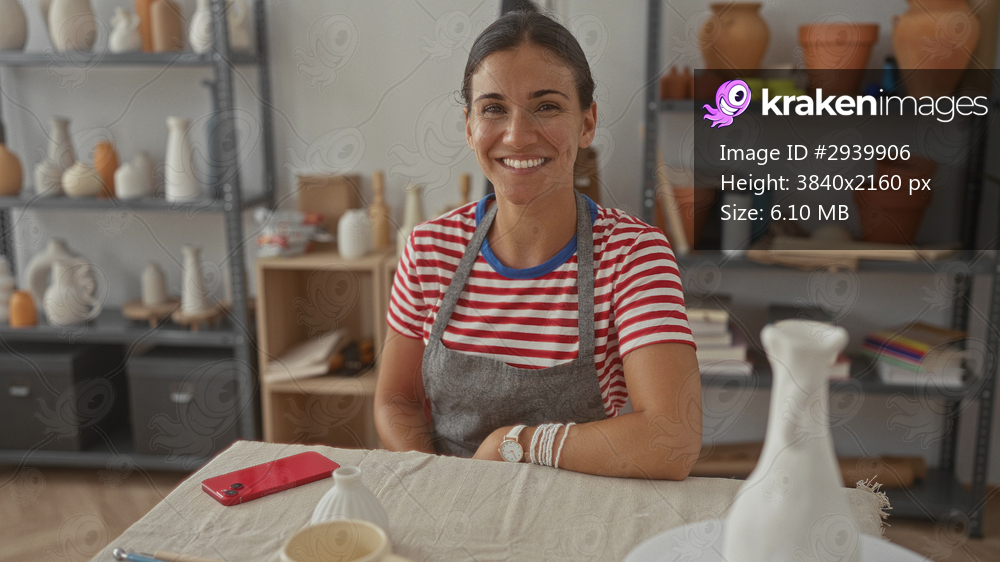Woman smiling seated at table with pottery and ceramic vase in studio workspace wearing apron and bracelets; handmade craft pride.