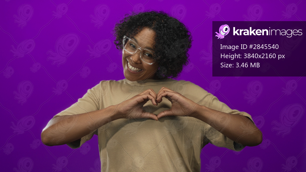 Woman smiling and shaping heart with her hands while wearing glasses in a purple studio space; love.