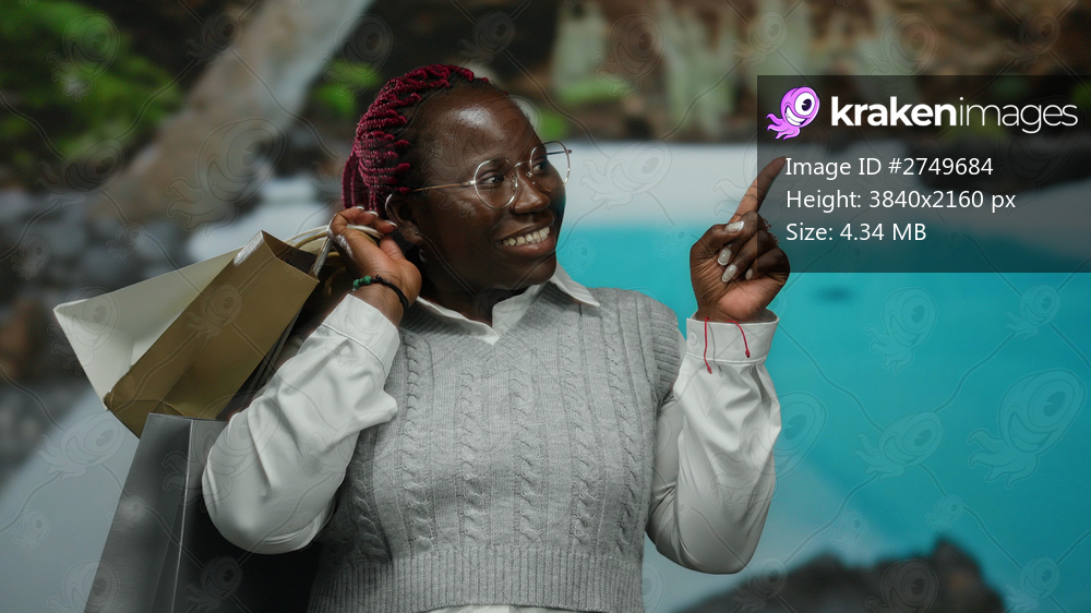 Woman smiling with shopping bags pointing at outdoor pool resort setting symbolizing leisure and enjoyment in vibrant vacation atmosphere with clear blue water in background. - Kraken Images