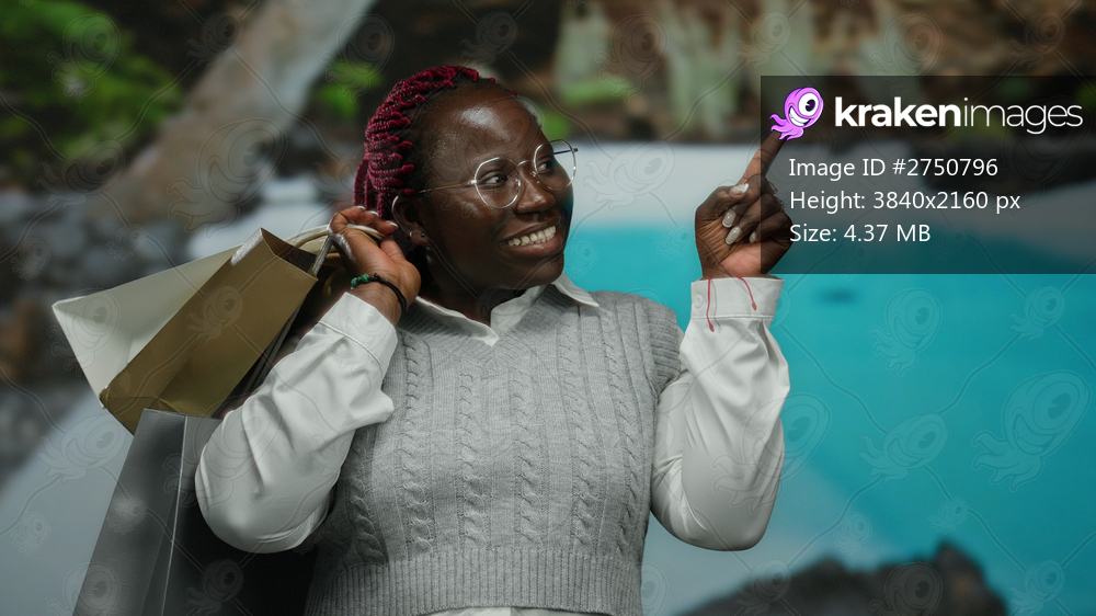 Woman smiling with shopping bags pointing at outdoor pool resort setting symbolizing leisure and enjoyment in vibrant vacation atmosphere with clear blue water in background. - Kraken Images