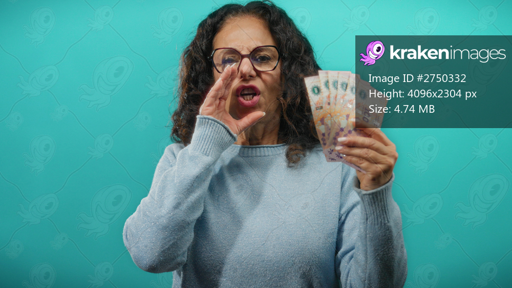 Woman smiling and shouting with argentine pesos in hand over an isolated blue wall, capturing a moment of excitement and financial prosperity.