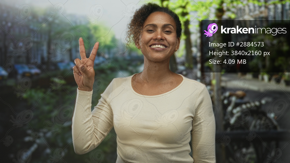 Woman smiling and showing a two finger peace sign with raised right hand on a canal street in amsterdam near parked bicycles; joy optimism.