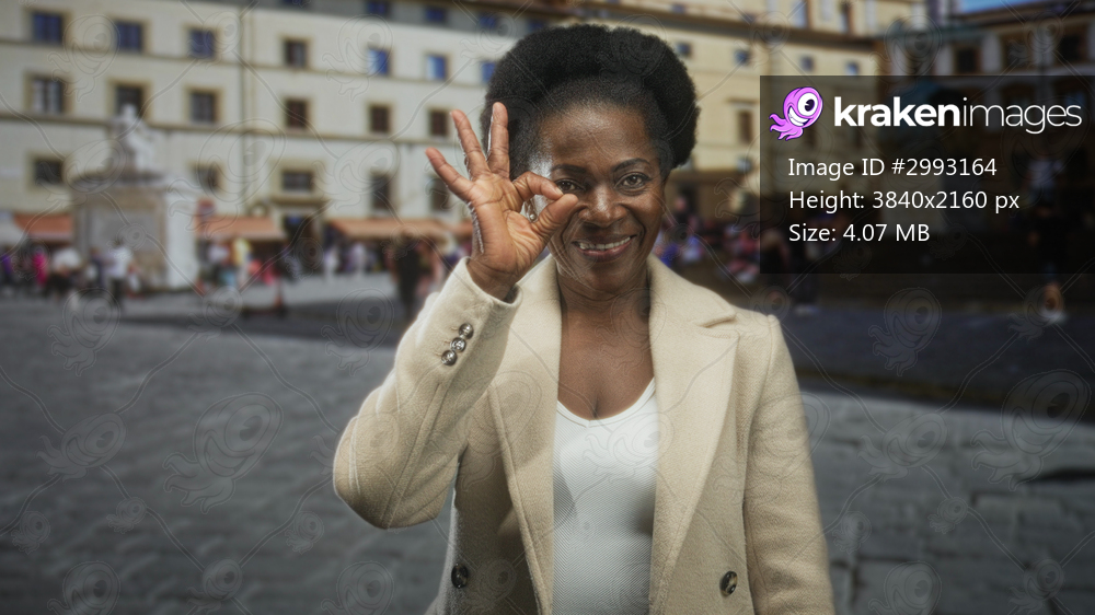 Woman smiling showing ok sign with right hand by face in street square with fountain and historic stone buildings; confidence optimism.