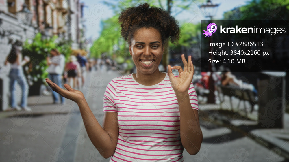 Woman smiling showing ok sign with right hand and left palm up, pointing finger to palm while wearing pink striped tshirt on street; joy confidence.