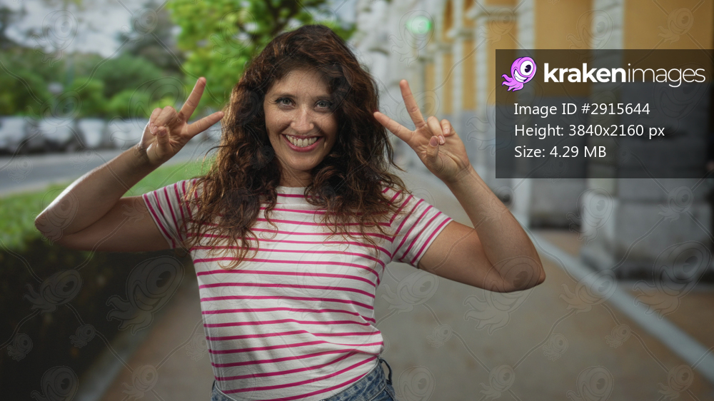 Woman smiling and showing peace signs with both hands on a city street with building columns and sidewalk, wearing striped shirt and jeans; youthful energy joy. - Kraken Images