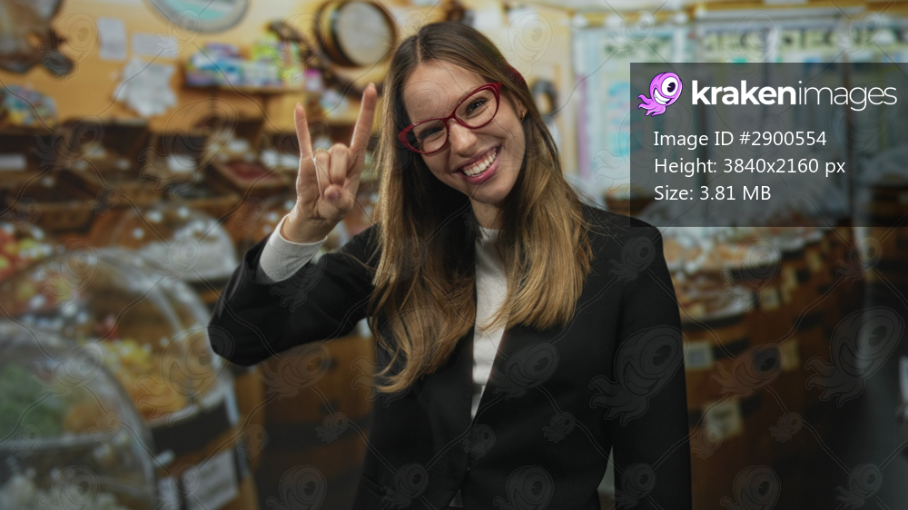 Woman smiling and showing rock horns with hand raised and red glasses in a candy store aisle lined with barrels and jars; joy celebration.