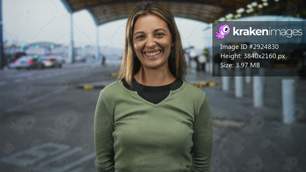 Woman smiling showing teeth at airport terminal curbside under canopy, face and shoulders visible, casual green top, standing near bollards and dropoff lane; travel joy. - Kraken Images
