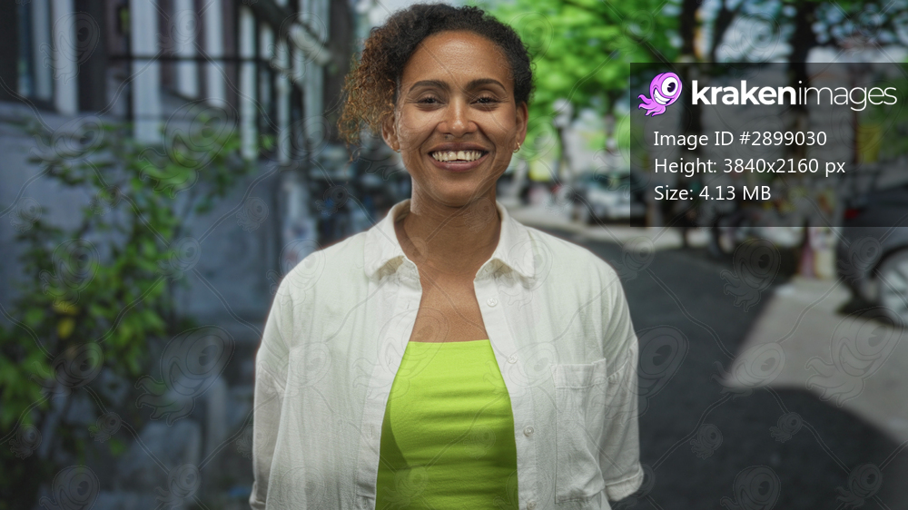 Woman smiling showing teeth in neon green top and open white shirt on a city street by parked cars and trees; casual happiness.