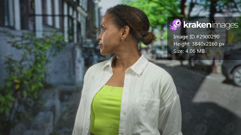 Woman smiling showing teeth in neon green top and open white shirt on a city street by parked cars and trees; casual happiness.