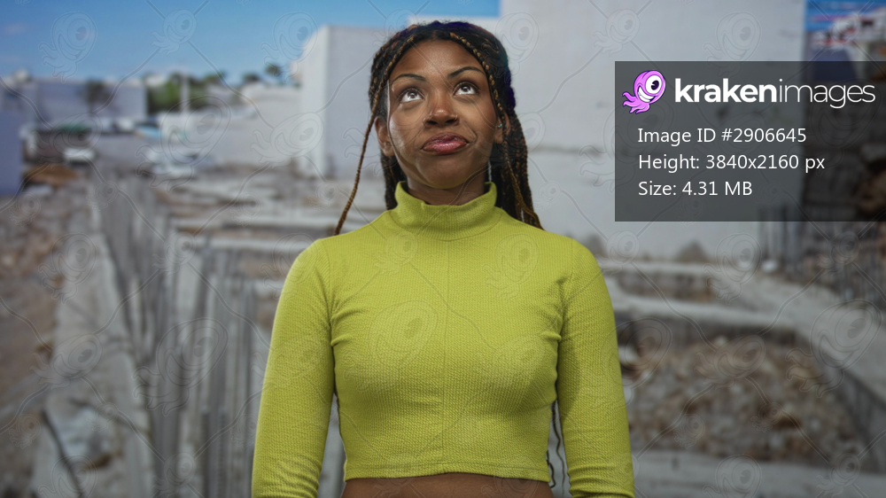 Woman smiling, showing teeth and looking up at a construction site, wearing lime green crop top with exposed midriff and braided hair; playful confidence. - Kraken Images