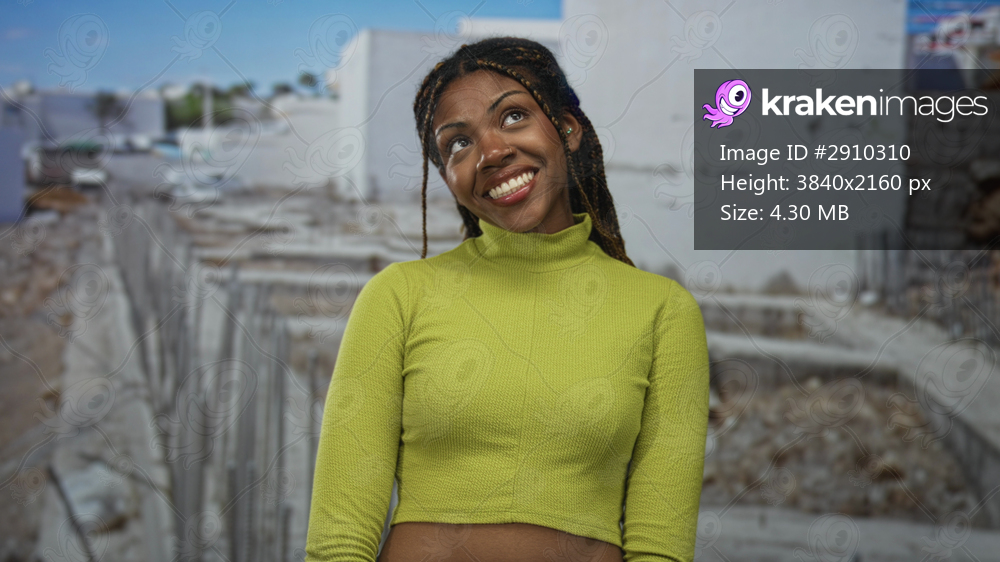 Woman smiling, showing teeth and looking up at a construction site, wearing lime green crop top with exposed midriff and braided hair; playful confidence. - Kraken Images