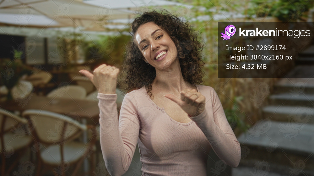 Woman smiling and showing thumbs up in a pink top on a restaurant terrace beside a stone building; casual joy.