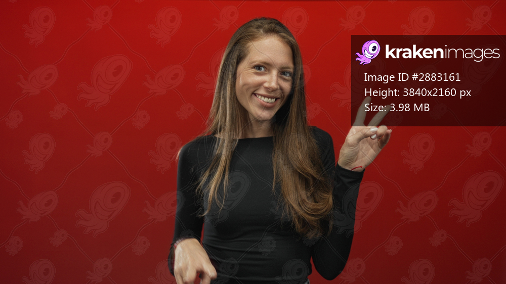 Woman smiling and showing two finger victory sign with right hand in studio with red backdrop; joy peace.