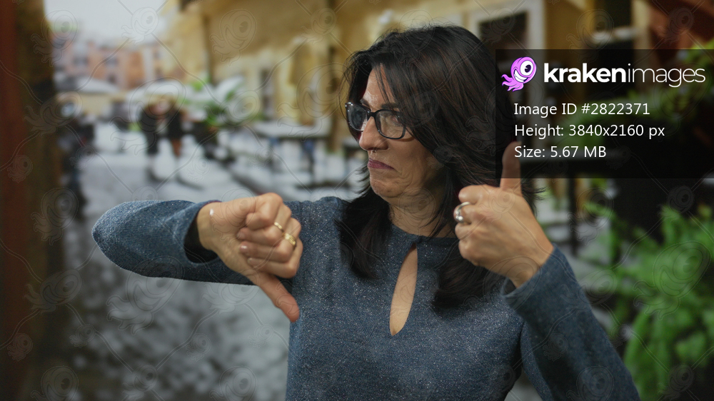 Woman smiling shows both thumbs up and thumbs down gesture on street in color; indecision contrast opinion evaluation.
