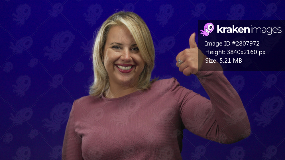 Woman smiling shows thumbs up with both hands in bright blue studio wearing mauve sweater; optimism.