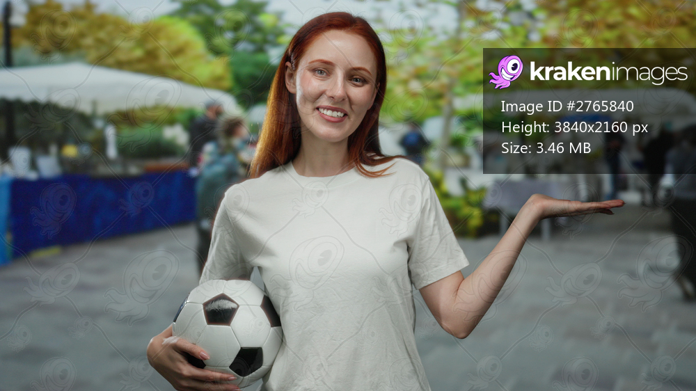 Woman smiling with soccer ball extends arm on outdoor market street.