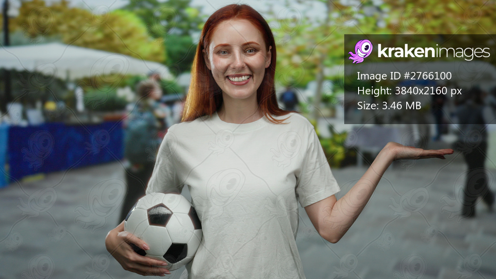 Woman smiling with soccer ball extends arm on outdoor market street.