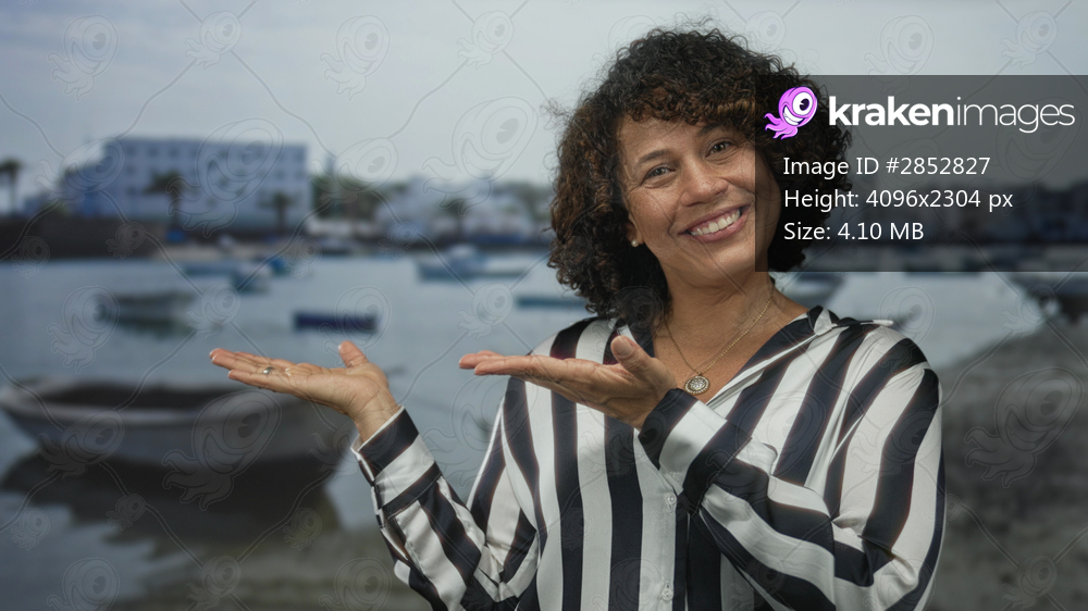 Woman smiling spreads both open palms up toward the calm waves at the shoreline of a sunny tropical beach; serenity.