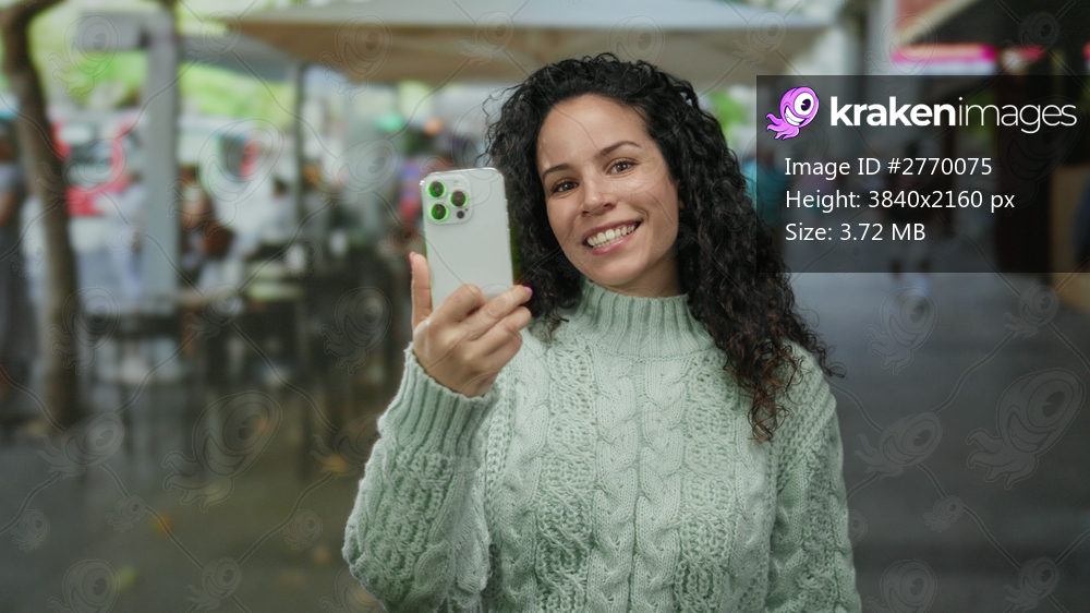 Woman smiling taking selfie with smartphone on terrace in outdoor restaurant setting, displaying happiness and modern technology in lively urban street environment. - Kraken Images