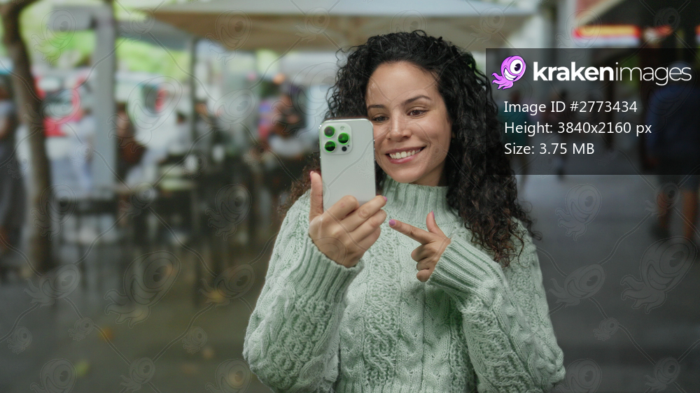 Woman smiling taking selfie with smartphone on terrace in outdoor restaurant setting, displaying happiness and modern technology in lively urban street environment. - Kraken Images