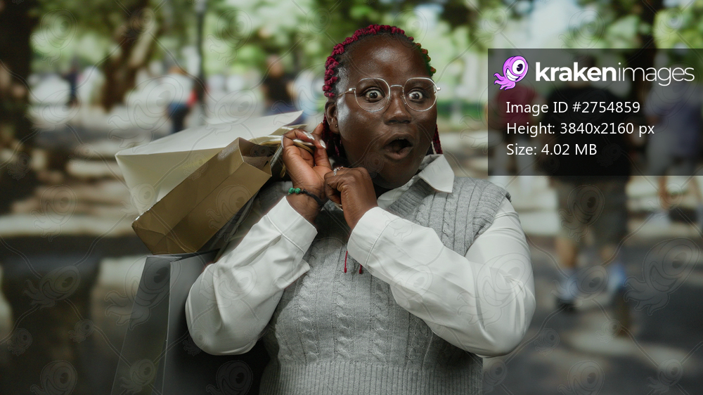 Woman smiling and talking on phone with shopping bags in her arms, standing in a sunny park with people in the background during a pleasant outdoor day. - Kraken Images