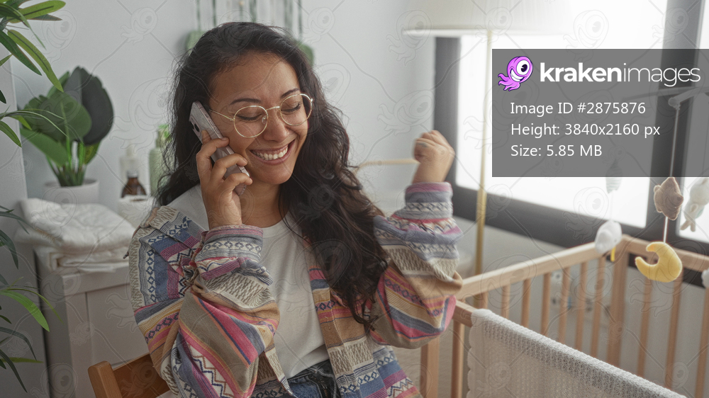 Woman smiling and talking on phone wearing patterned jacket next to wooden crib in building nursery; motherhood happiness.