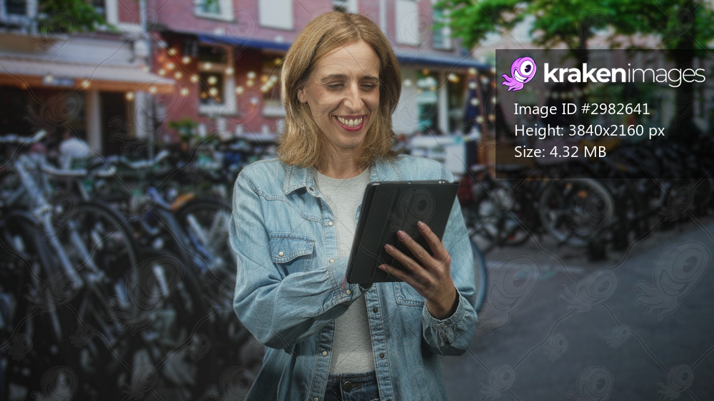 Woman smiling, tapping a tablet with bare hands on a street lined with parked bicycles and cafe lights; contentment daily routine.