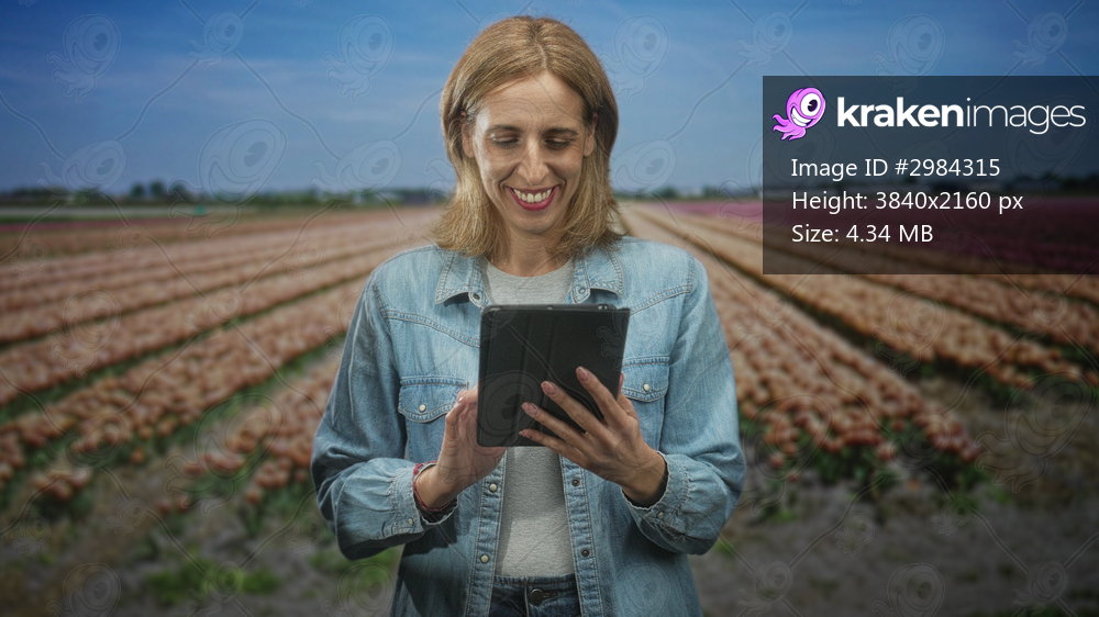 Woman smiling and tapping tablet screen, hands visible holding device while standing before a tulip field backdrop in a studio; joy connection.