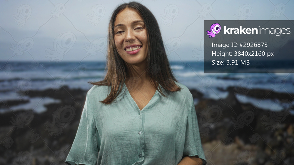 Woman smiling with teeth and relaxed shoulders in a light green shirt at studio by the rocky seaside coast, facing camera; serenity.