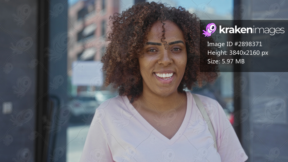 Woman smiling with teeth and shoulder bag standing in front of a street storefront window with curly hair and v neck shirt; casual everyday joy.