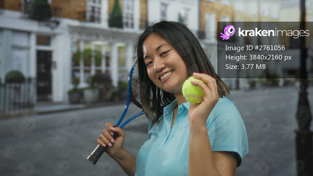 Woman smiling with tennis racket and ball in city street, showcasing outdoor sport in urban environment with young asian female enjoying recreational activity. - Kraken Images