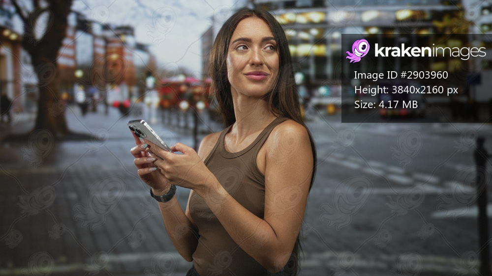 Woman smiling and texting on a city street while holding smartphone; digital connection contentment.