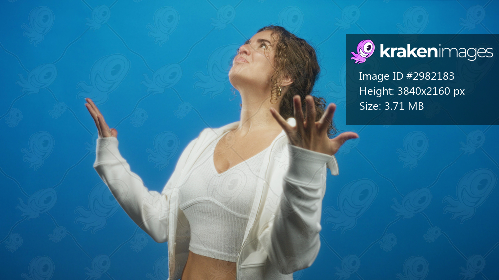 Woman smiling with thumbs to chest, looking upward, wearing white crop top and zip hoodie in studio; joyful playful confidence.