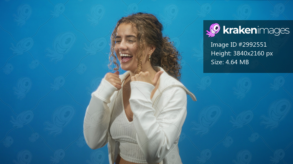 Woman smiling with thumbs to chest, looking upward, wearing white crop top and zip hoodie in studio; joyful playful confidence.