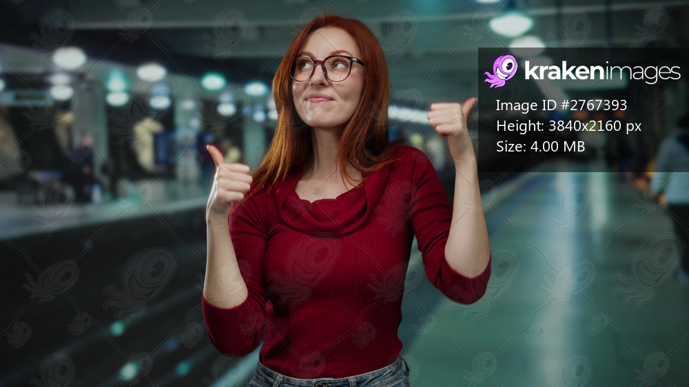 Woman smiling with thumbs up at indoor train station with blurred background wearing red shirt and glasses showing positive emotion in vibrant setting