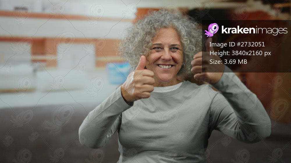 Woman smiling with thumbs up in an indoor construction site, showing confidence and positivity in a casual outfit with curly grey hair.