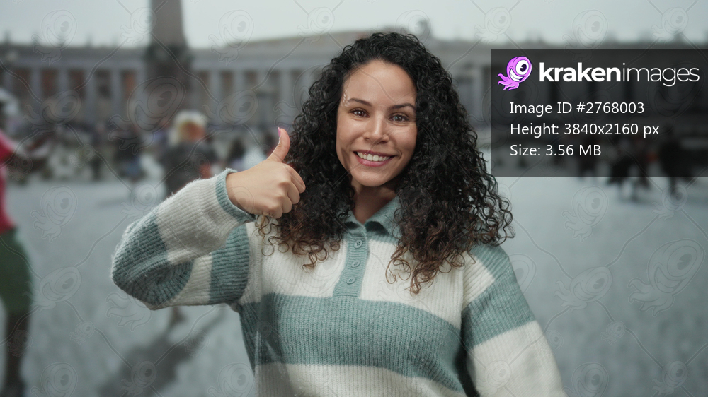 Woman smiling with thumbs up in vatican city square, showcasing excitement and positivity in an iconic outdoor location.