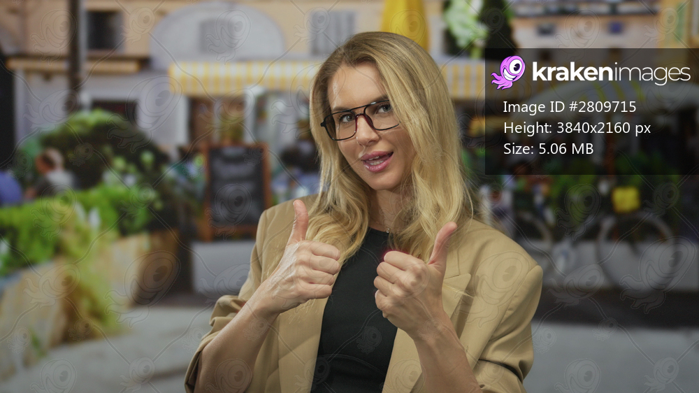 Woman smiling with thumbs up on a city street, showcasing confidence and positivity amidst urban outdoor background.