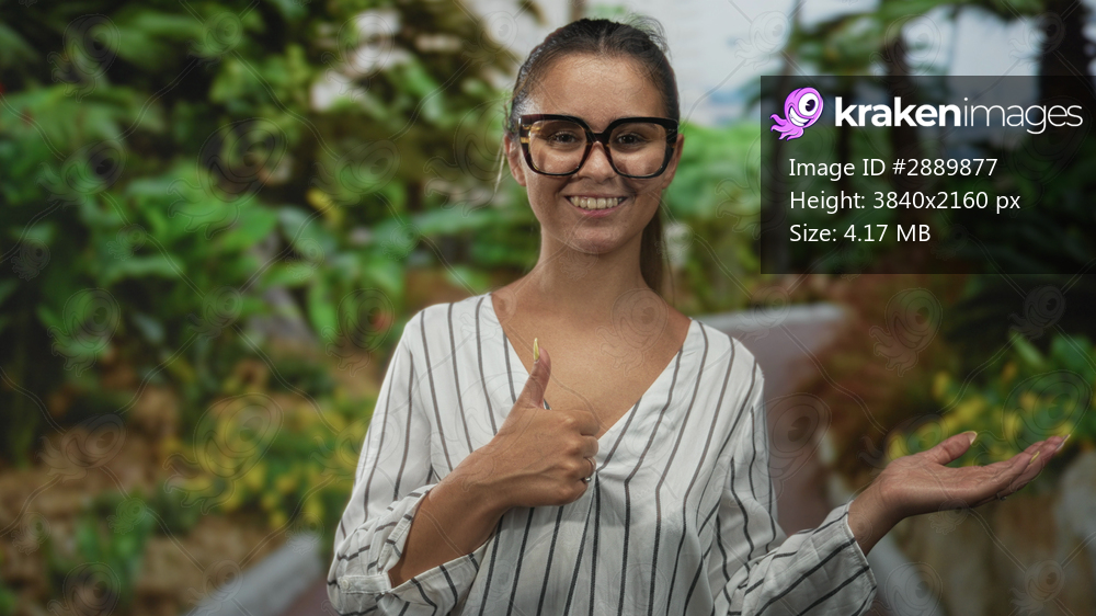 Woman smiling with thumbs up and open palm gesture in green park wearing oversized glasses and striped blouse, facing camera; confidence welcome.