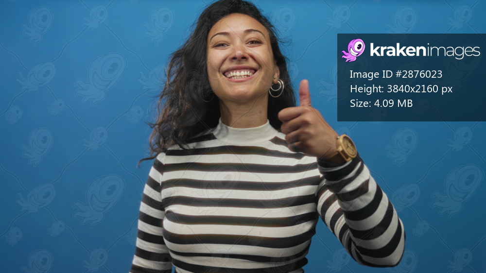 Woman smiling with thumbs up wearing striped sweater and wooden watch in blue studio; happiness approval confidence.