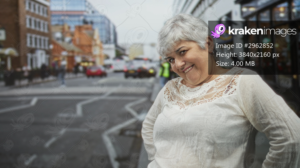 Woman smiling and tilting her head back with hand on hip, wearing white lace top on street by storefronts; joy confidence.