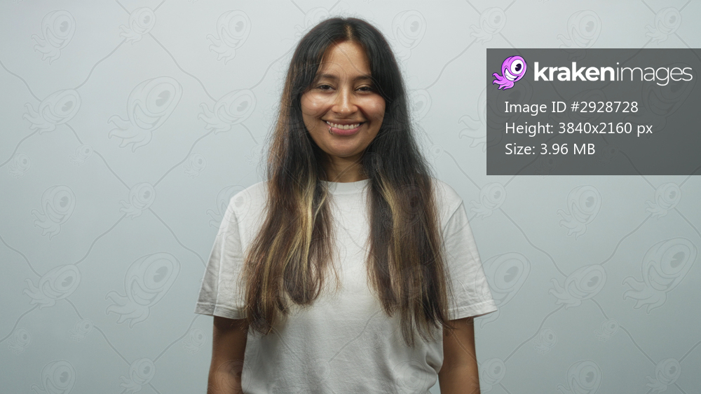 Woman smiling with tongue out and long hair in studio against a pale gray backdrop; playful confidence.