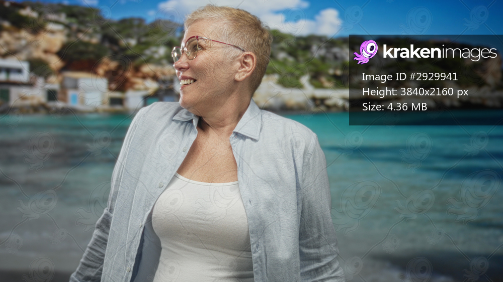 Woman smiling and turning her head, bare chest visible beneath an open shirt against a studio beach backdrop with turquoise water and rocky shoreline; serenity carefree escape. - Kraken Images