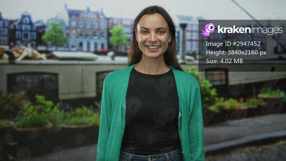 Woman smiling and turning her head, face visible, wearing green cardigan and black top, standing by a houseboat and canal on amsterdam street; urban serenity. - Kraken Images