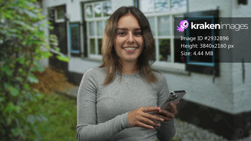 Woman smiling and typing on smartphone with hands at house entrance building by white window while holding phone; everyday connection contentment.