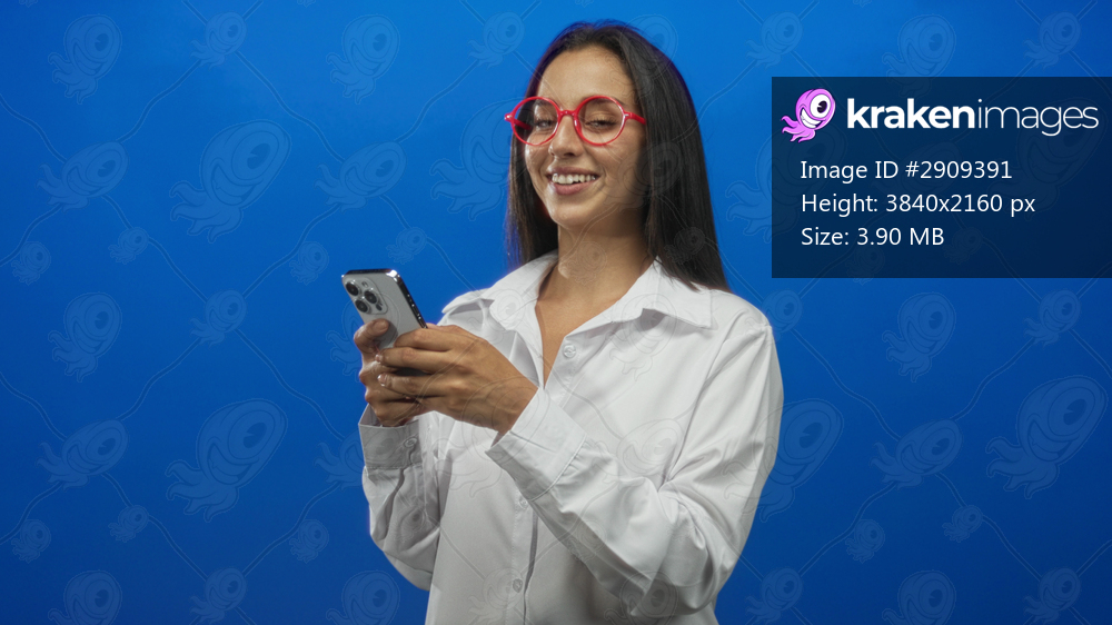 Woman smiling and typing on smartphone with hands visible, wearing red glasses and white shirt in studio; happiness connection.