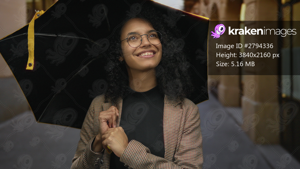 Woman smiling under an umbrella on a charming old town street exuding a sense of joy and warmth on a peaceful day with vintage architecture surrounding her lively outdoor experience. - Kraken Images