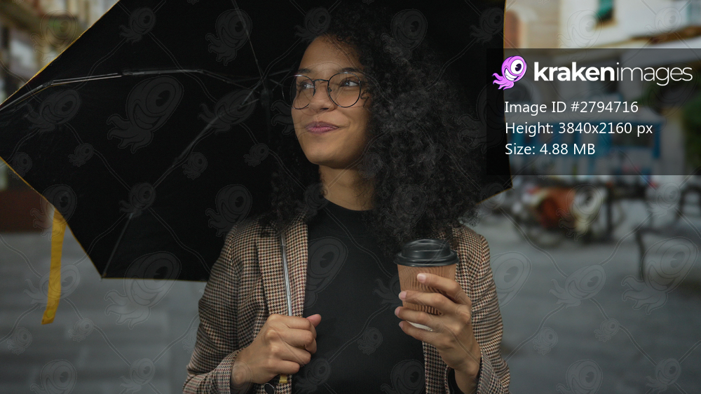 Woman smiling under umbrella holding coffee on rainy day in urban street displaying joy and confidence in vibrant outdoor setting.