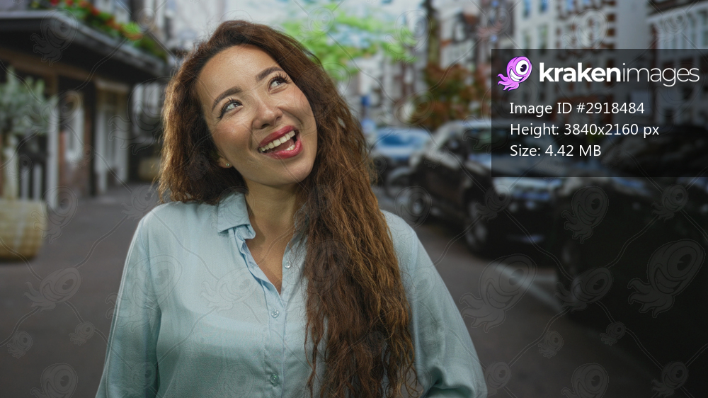 Woman smiling with visible face and long hair tilting head on city street, wearing light blue shirt; contentment daydream.