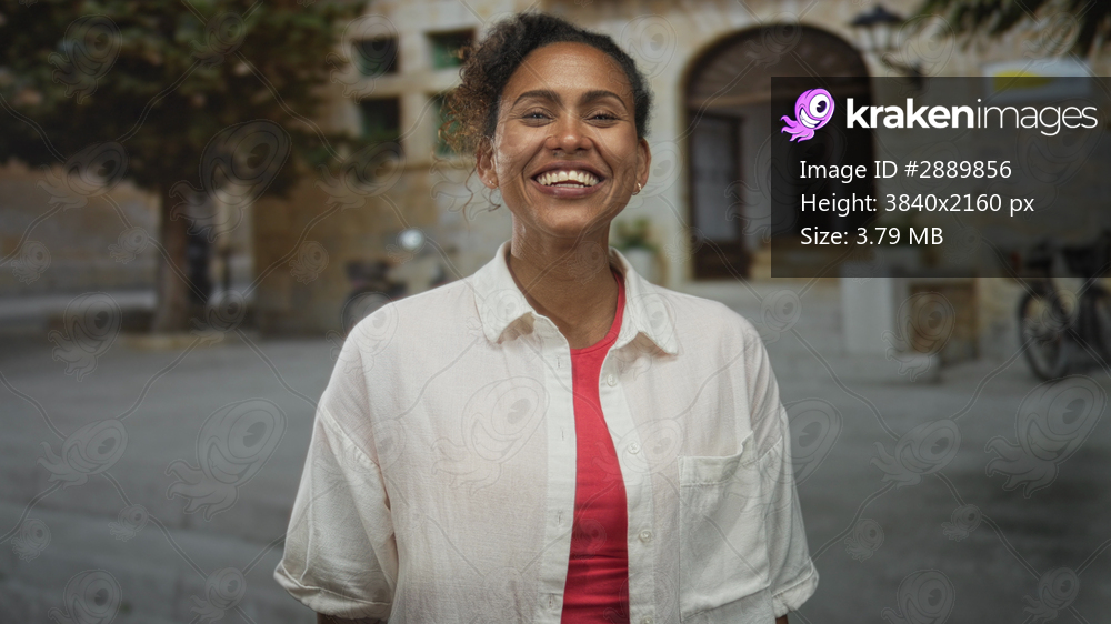 Woman smiling with visible face on a street in front of a stone building, wearing white shirt and coral top; joy confidence.